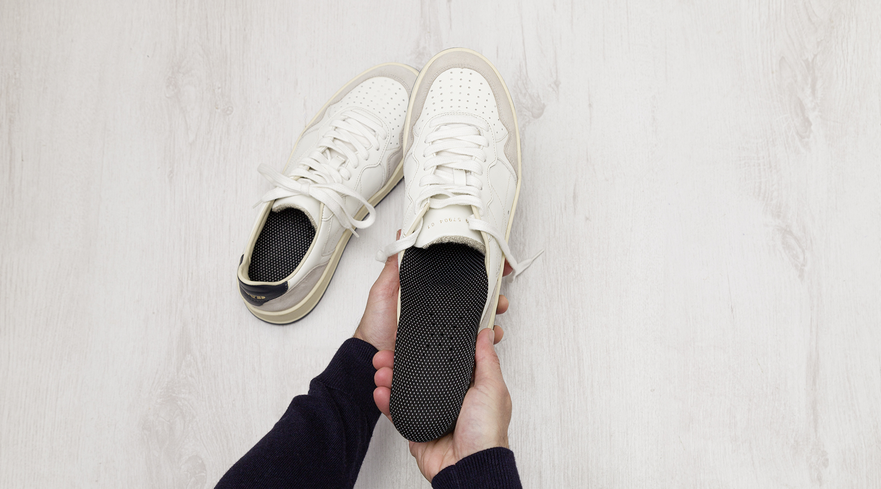 Nicht verklebte Innensohle vorher aus dem Schuh nehmen. Das Fußbett Balance Fresh leicht längs zusammendrücken und in den Schuh schieben. Gegebenenfalls mit den Fingern in den Schuh gehen und die Sohle richtig platzieren.