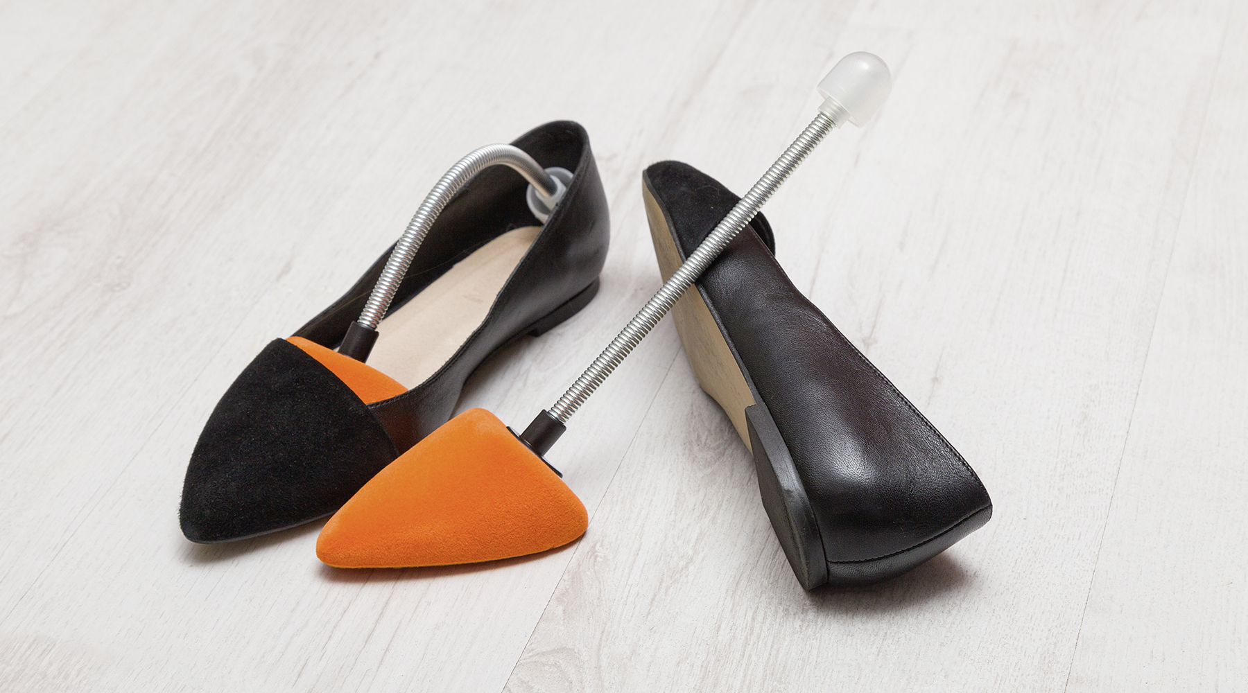 Den Schuhformer mit Spiralfeder nach dem Tragen in die Schuhe legen, um Gehfalten zu verhindern und dem Schuh überschüssige Feuchtigkeit sowie unangenehme Gerüche zu entziehen.