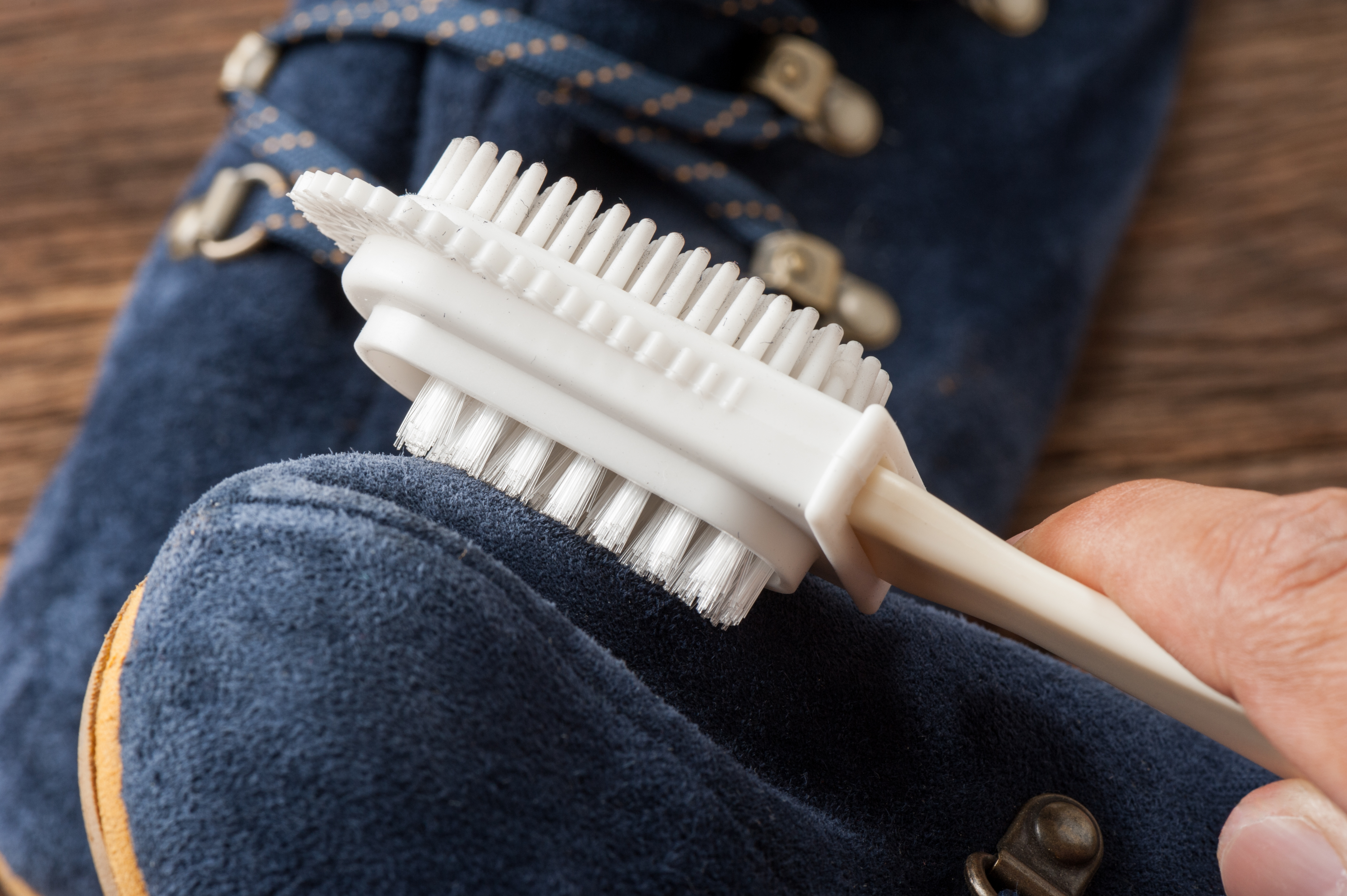 Mit den Nylonborsten der Bürste den Schmutz vom Leder entfernen. Zum Säubern der Kanten oder Nähte eignet sich die Reinigungskante an der Seite der Bürste. Danach das Pflegemittel verwenden und den Schuh gut trocknen lassen. Zum Schluss mit der Rückseite des Gummikopfes das Leder in eine einheitliche Richtung kämmen. Die Bürste kann mit Wasser und Seife gereinigt werden.