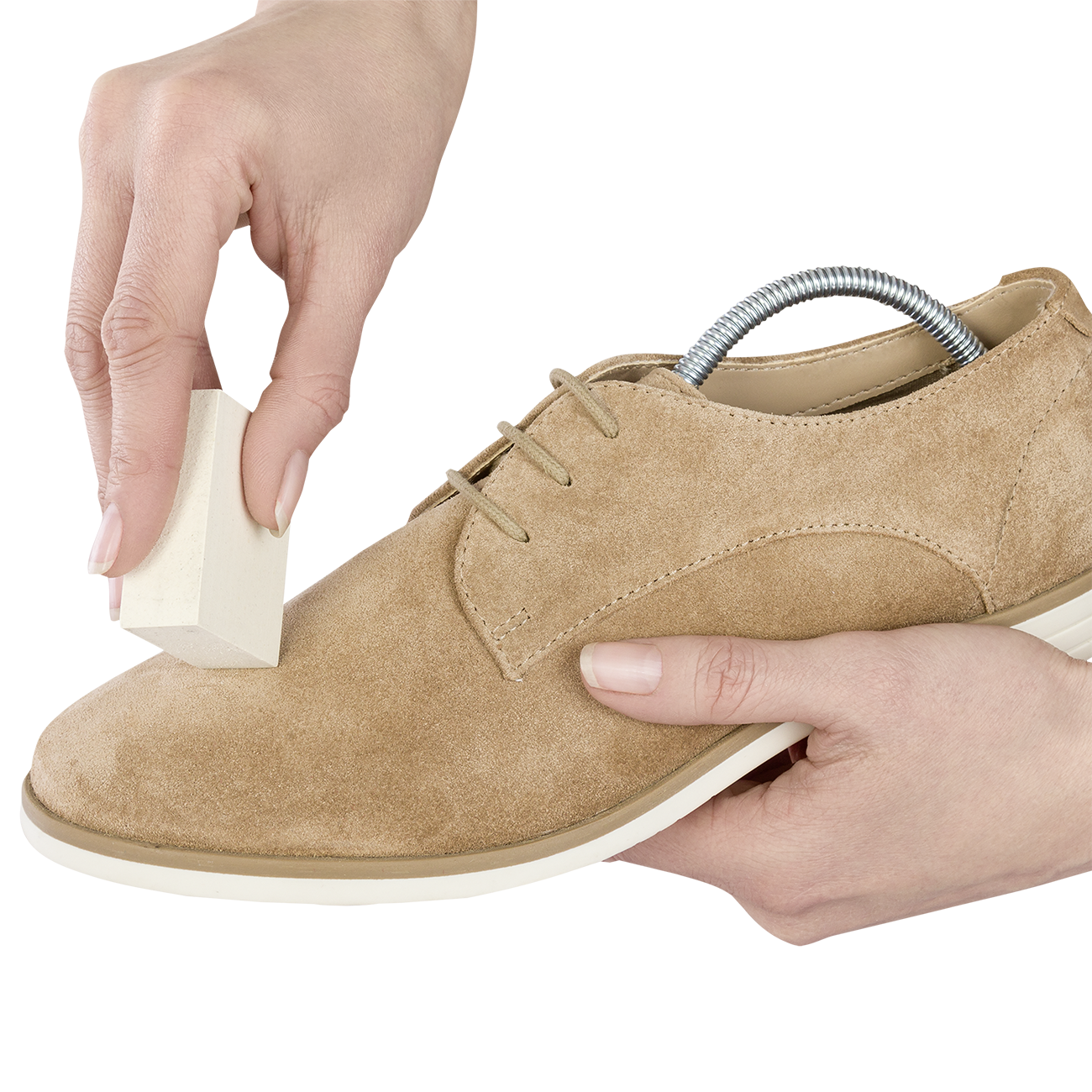 Vor der Anwendung groben Staub und Schmutz entfernen. Mit dem Gummi mehrfach über Flecken und Verschmutzungen radieren. Nach der Behandlung ggfs. großflächig mit einer Raulederbürste bearbeiten. Der leicht sandige Gummi verbraucht sich bei der Behandlung im Laufe der Zeit.