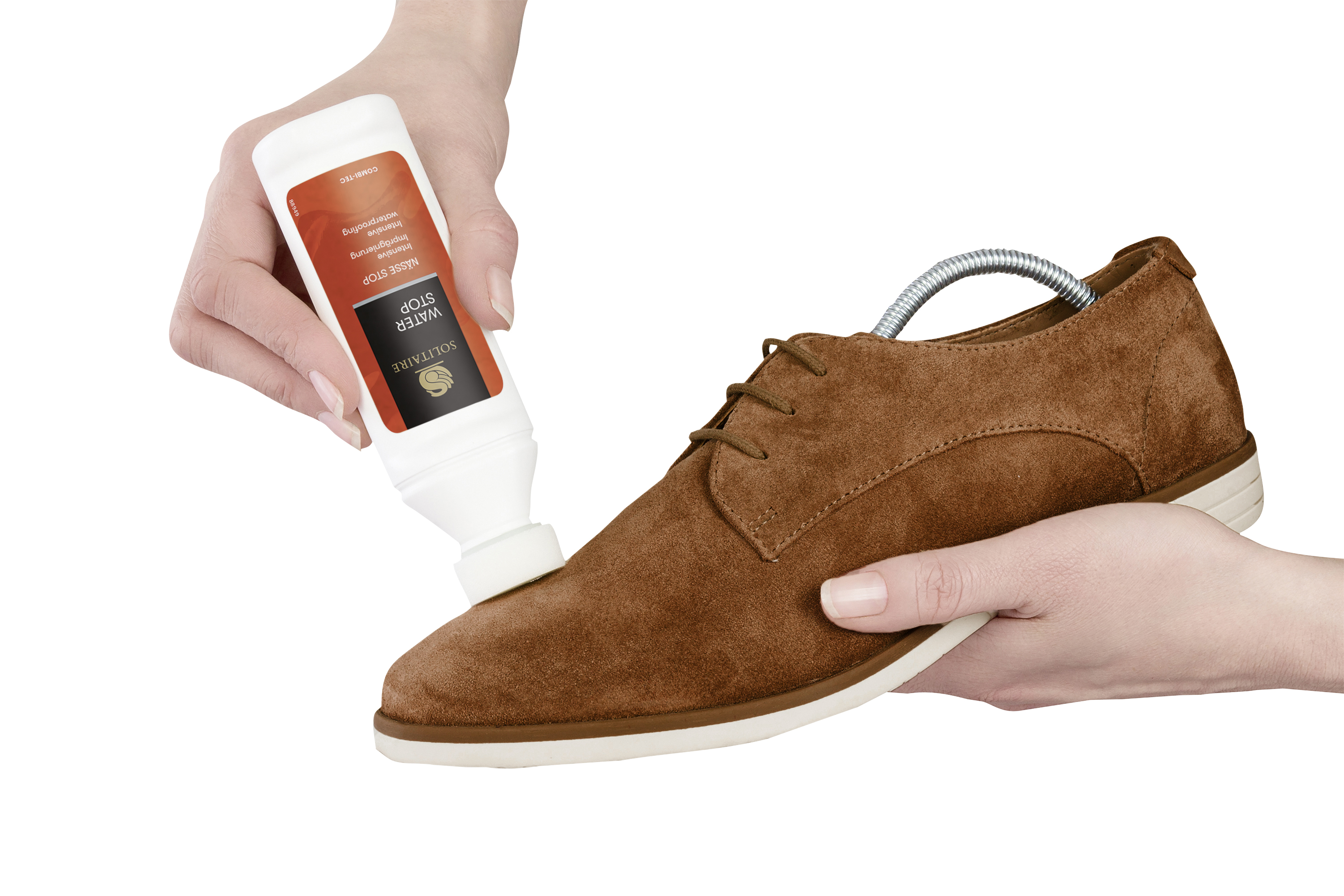 Vor der Anwendung Staub und Schmutz entfernen. Material an einer unauffälligen Stelle (z.B. Innenseite der Ferse) auf Farbechtheit prüfen. Den Schwamm auf der Material aufsetzen und leicht andrücken. Mit wenig Druck gleichmäßig auf dem Material verteilen (tupfend oder kreisend) und gut trocknen lassen. Rauleder ggfs. anschließend sanft aufbürsten.